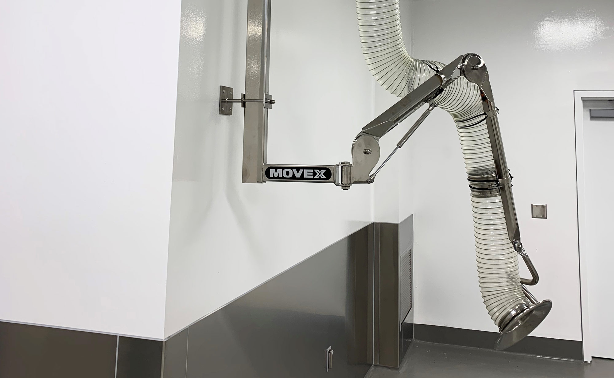 The solution was to have wall brackets on specially adapted panels with stepless rails. That made it possible to adjust the wall plate sideways, making it simple and straightforward to move the extractors to the desired position. Fumex’ MiniTEX, a compact, telescopic extraction arm with high air velocity in the suction nozzle and effective capture of pollutants, was used as an extractor in the system.